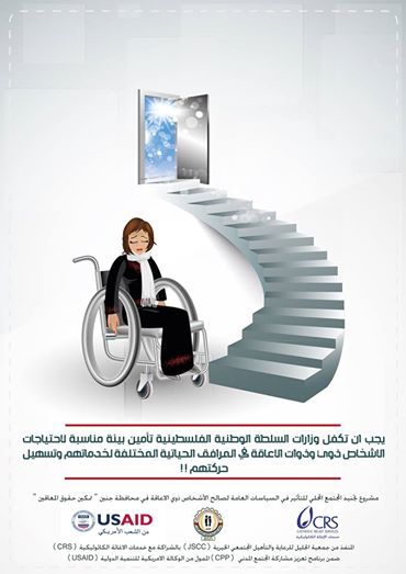 الإسم: يجب ان تكفل وزارات السلطة الوطنية الفلسطينية تأمين بيئة مناسبة لاحتياجات الاشخاص ذوي وذوات الاعاقة في المرافق الحياتية المختلفة لخدماتهم وتسهيل حركتهم !!