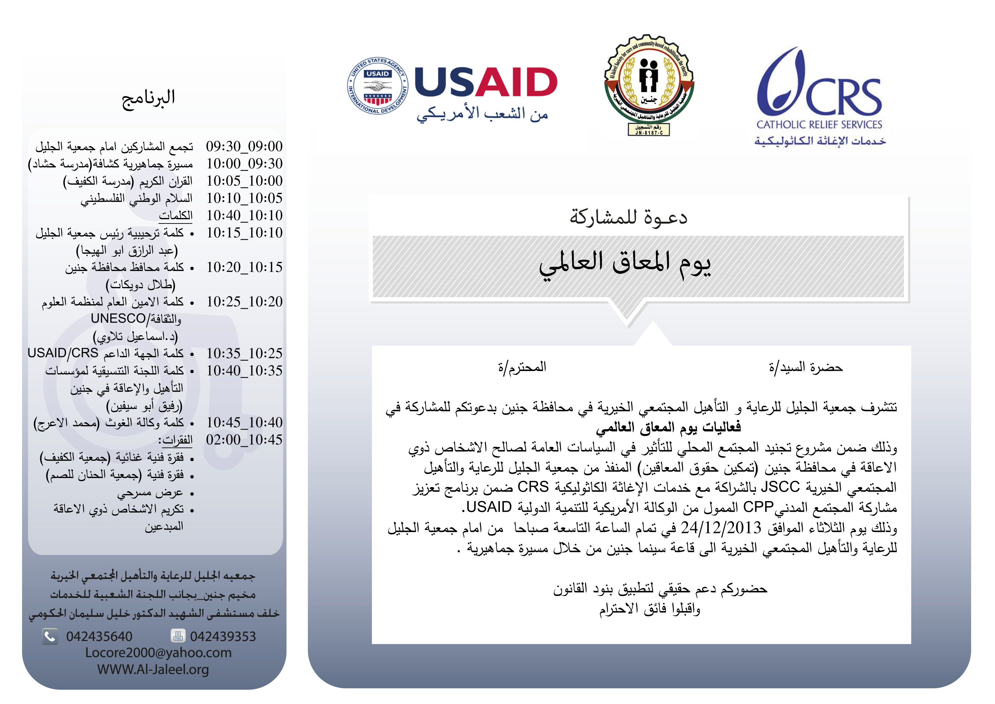 للمشاركة في فعاليات "يوم المعاق العالمي" الذي يتعلق بحقوق الاشخاص ذوي الاعاقة في محافظة جنين وتمكينهم .. |